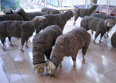 Die Schafsherde sieht verdammt echt aus. Erst beim zweiten Blick entdeckt man, dass sich, bei den Schafen, statt Gesichter, Telefone platziert haben. Es stellt sich glatt die Frage, was will der Künstler damit ausdrücken? Wenn dieser Punkt überwunden ist, fällt einen auf, dass die Beine aus Telefonhörern bestehen. Und aus was besteht das Schafsfell? Eine Idee steigt auf. Jetzt überlassen wir es dem Betrachter. Mal sehen, was ihr noch so entdeckt!