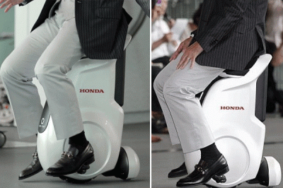 Um mit größerer Mobitität die riesigen Büroschluchten bewältigen zu können, hat Honda hat ein neues Fahrzeug vorgestellt. Diesmal ist es kein Auto, sondern ein Sitzrad. Gesteuert wird das Uni-Club-Sitzrad durch die Verlagerungen des Körpergewichts. Die Hände sind frei für Laptop und Akten.
