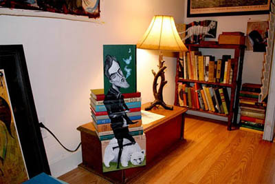 Mike Stilkay nennt seine Kunstobjekte Buchskulptur, als Malmaterial benutzt er Acrylfarbe und Ölfarbstifte. Schöne elegante Menschen und Tiere wählt er als Motive und mit Vorliebe porträtiert er sich selber.