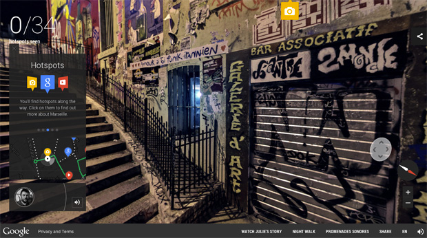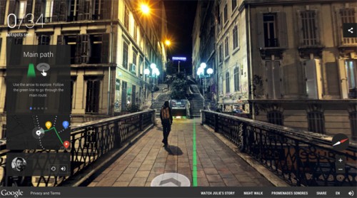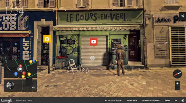 Night Walk ist ein neues interessantes Google Projekt. Es verbindet mehrere Google Dienste zu einem akustischen Stadt-Spaziergang. Mit Hilfe von Google Street View bewegt man sich dabei durch das Szene-Viertel Cours Julien von Marseille. Julie und Christophe, zwei Sprecher, erklären unterschiedliche Sehenswürdigkeiten des Viertels. Ergänzt wird das Bildmaterial aus Street View durch coole Videos. So folgt man einer Katze in ein Restaurant, wo gerade leckerer Fisch zubereitet wird oder man sieht wie ein Mural an einem Rolltor eines Geschäftes entsteht. “Night Walk” sollte man auf jeden Fall einmal austesten, viel Spass.