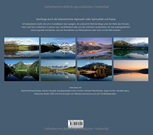 Abseits des kleinkarierten Alpenkitschs hat der Autor die Panoramen der Alpen-landschaft mit ihrer ganz besonderen ästhetischen Anziehungskraft in außergewöhnlich stimmungsvollen Fotoaufnahmen, überwiegend Bergseespiegelungen, festgehalten. Die Kompositionen dieser Bilder lassen den Gedanken des Betrachters den nötigen Raum zur Reflexion über Gott und die Welt. Zusammen mit den literarischen Kleinoden und philosophischen Gedanken von Persönlichkeiten aller Zeitepochen sowie Interviews und Wortbeiträgen von Zeitgenossen entstand ein nachdenkliches und sinnliches Lese- und Bilderbuch über eine der schönsten Landschaftsformen unserer Erde……