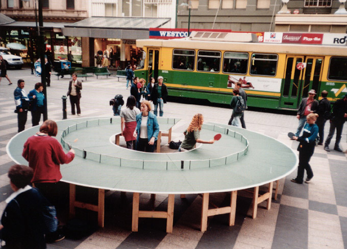“Ping-Pong-Go Round” ist ein runder Tischtennis Spass des in Singapur ansässigen Künstlers Lee Wen. “A round Ping-Pong table was made out of plywood. It was made up of 15 tabletops to be set up as doughnut shaped. The diameter was 6 meters across. Players play from inside to another player on the outside. After constructing it, the table was set up for a day in a community center for play by casual visitors. It looked like a sculpture by itself and yet when it is being played it becomes a structure for a sport or game.”