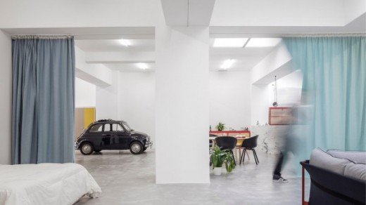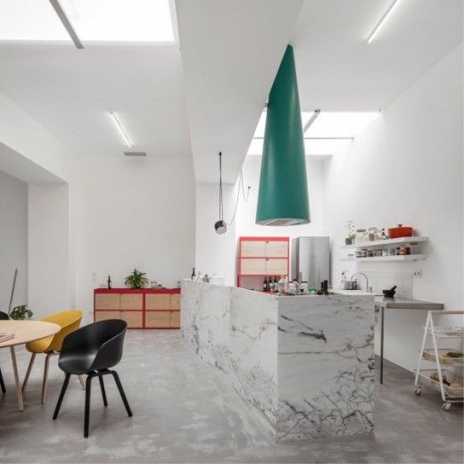 Das Fala Atelier Studio aus Porto in Portugal hat eine 200 Quadratmeter große fensterlose Garage in Lissabon in einen hellen, offene und lebenswerten Wohnraum für ein junges Paar mit einem Parkplatz für ihr Auto umgewandelt.